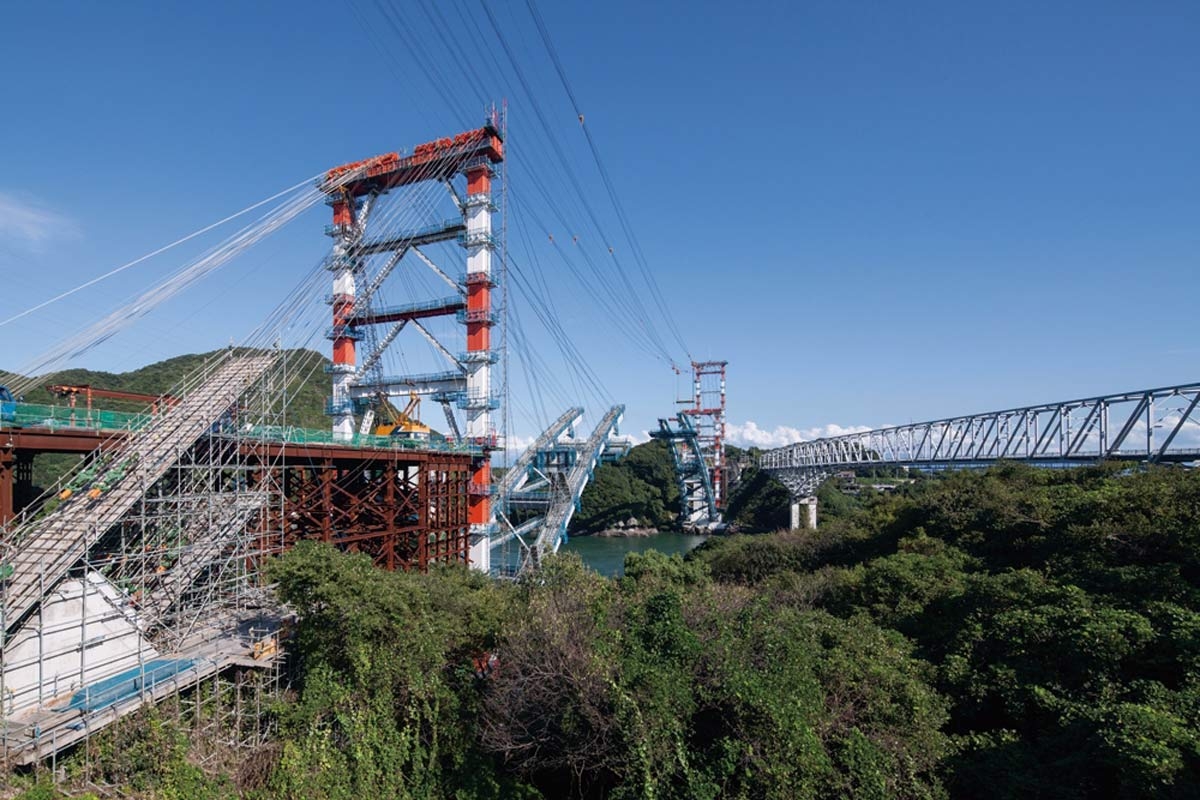 架設中の天城橋 ケーブルエレクション斜吊り工法でアーチ部材を両岸から張り出す 横河ブリッジ 日本ピーエス 吉田組 吉永産業jvが施工した 写真 イクマ サトシ 日経クロステック Xtech